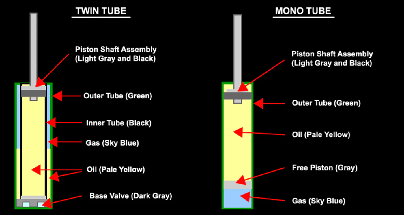 在雙管阻尼器上,油和氮氣共享相同的體積。阻尼器的內管或工作管基本上都是阻尼油,而外管是某些阻尼器油的混合物,而頂部(因為氣體比阻尼器油輕)是氮氣。因此,當活塞軸壓縮到減震器中時,機油將物理壓縮外管中的機油。